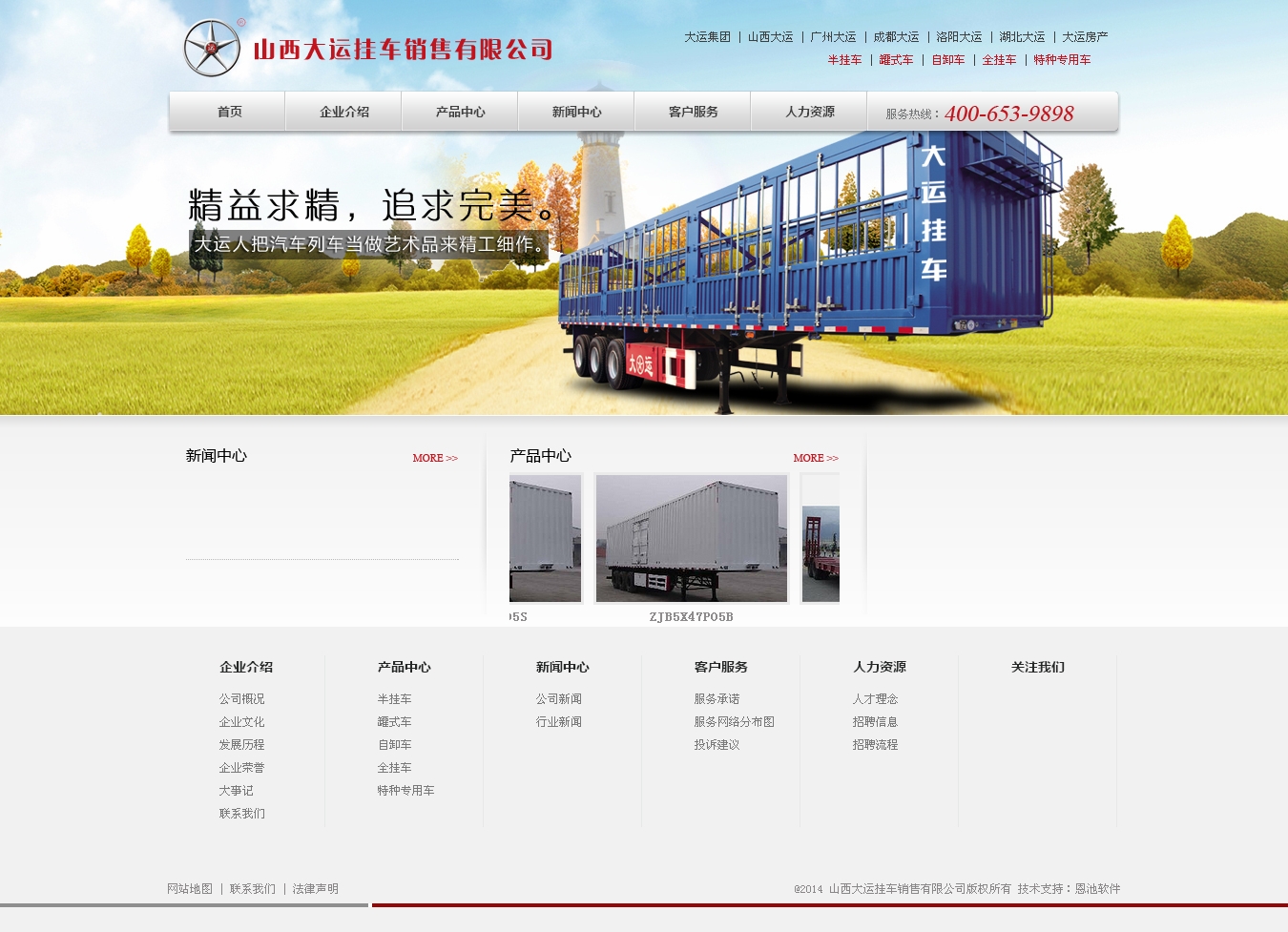 專業(yè)服務(wù),演繹神奇。大運(yùn)掛車擁有專業(yè)的銷售團(tuán)隊(duì),能夠根據(jù)用戶貨源、運(yùn)輸距離、作業(yè)環(huán)境,對(duì)用戶選擇車型和配置提出建議。有了專業(yè)指導(dǎo),大運(yùn)掛車的用戶往往比同行的車輛出勤率更高,維護(hù)成本更低,運(yùn)營(yíng)更賺錢。大運(yùn)掛車不斷健全售后網(wǎng)點(diǎn)建設(shè),確保為用戶提供一流的售后服務(wù)。遍布各銷售區(qū)域的特約維修站,及時(shí)快捷地滿足用戶的各種服務(wù)需求。針對(duì)不同區(qū)域,公司對(duì)特約維修站制訂不同的優(yōu)惠政策,提高各地服務(wù)站點(diǎn)的服務(wù)積極性。 惟有熱愛(ài),方能堅(jiān)持。惟有堅(jiān)持,方能成就!面對(duì)激烈的市場(chǎng)競(jìng)爭(zhēng),公司在今后的發(fā)展中,將堅(jiān)持以集團(tuán)“建立具有敦厚理念及價(jià)值觀的企業(yè)文化,成為對(duì)社會(huì)貢獻(xiàn)最有成就的企業(yè)”發(fā)展目標(biāo)為指導(dǎo),憑借一流的產(chǎn)品和優(yōu)質(zhì)的服務(wù),快速拓展市場(chǎng),持續(xù)地為合作商家和用戶創(chuàng)造財(cái)富,為社會(huì)做出貢獻(xiàn)!